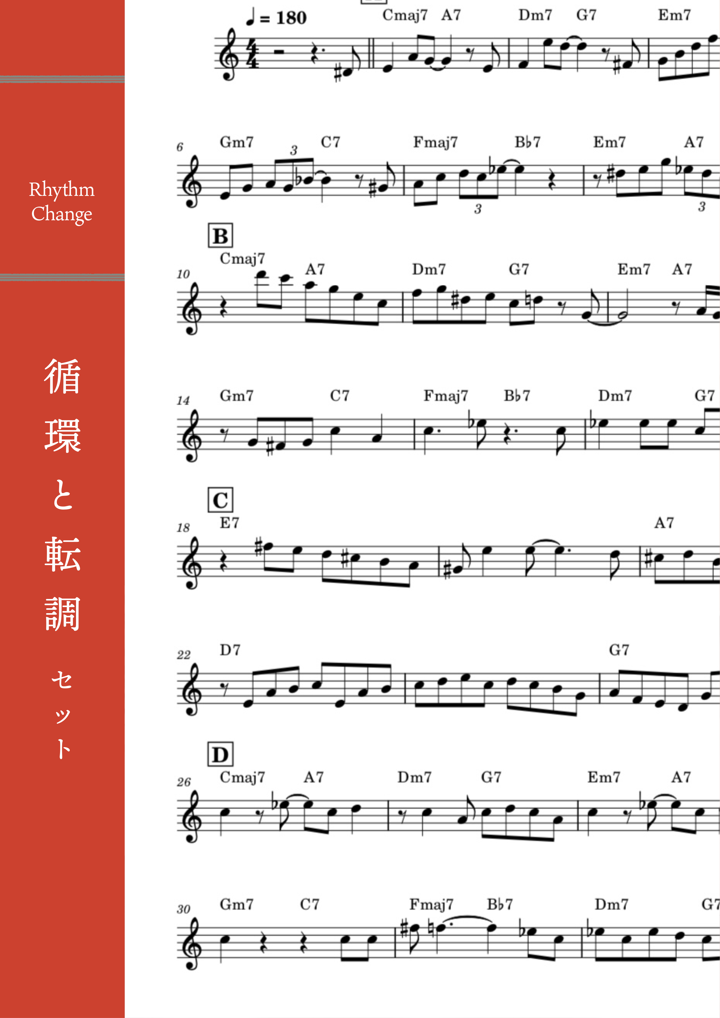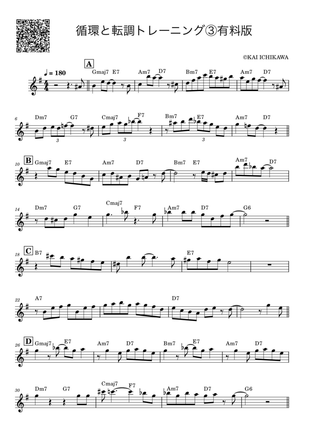 動画「循環と転調トレーニング①〜③」の練習用楽譜有料版が全て入ったセットです。