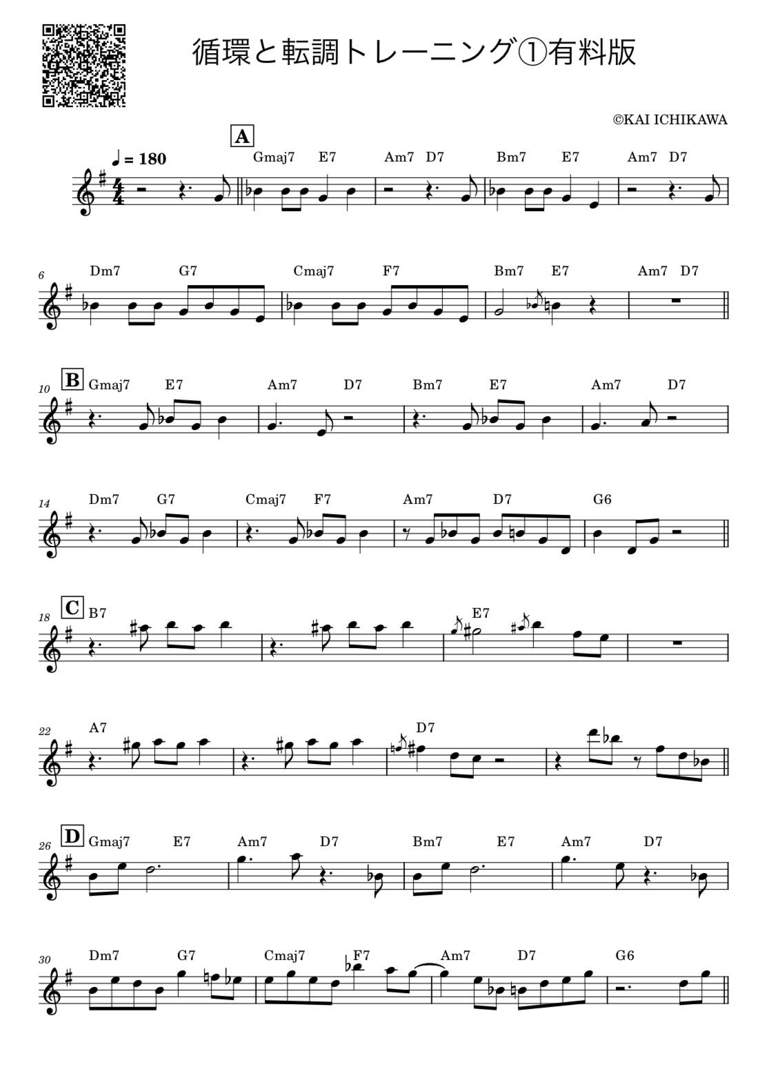 動画「循環と転調トレーニング①」の練習用楽譜有料版です。